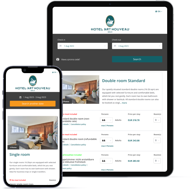Guests will effortlessly book their rooms using the intuitive calendar and date-search functions. The individually configurable booking button simplifies the entire booking process. Easily install MasterBookings onto your existing website and watch your direct booking revenue reach the sky.